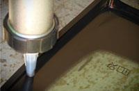 Az injektort leszerelve, egy műgyantával megkent lapkát helyezünk a néhai sérülés helyére, és UV fénnyel megszárítjuk. Pár perc alatt a gyanta megszárad és a lapka eltávolítása után, az üvegre merőlegesen tartott pengével lekaparható a felesleg.